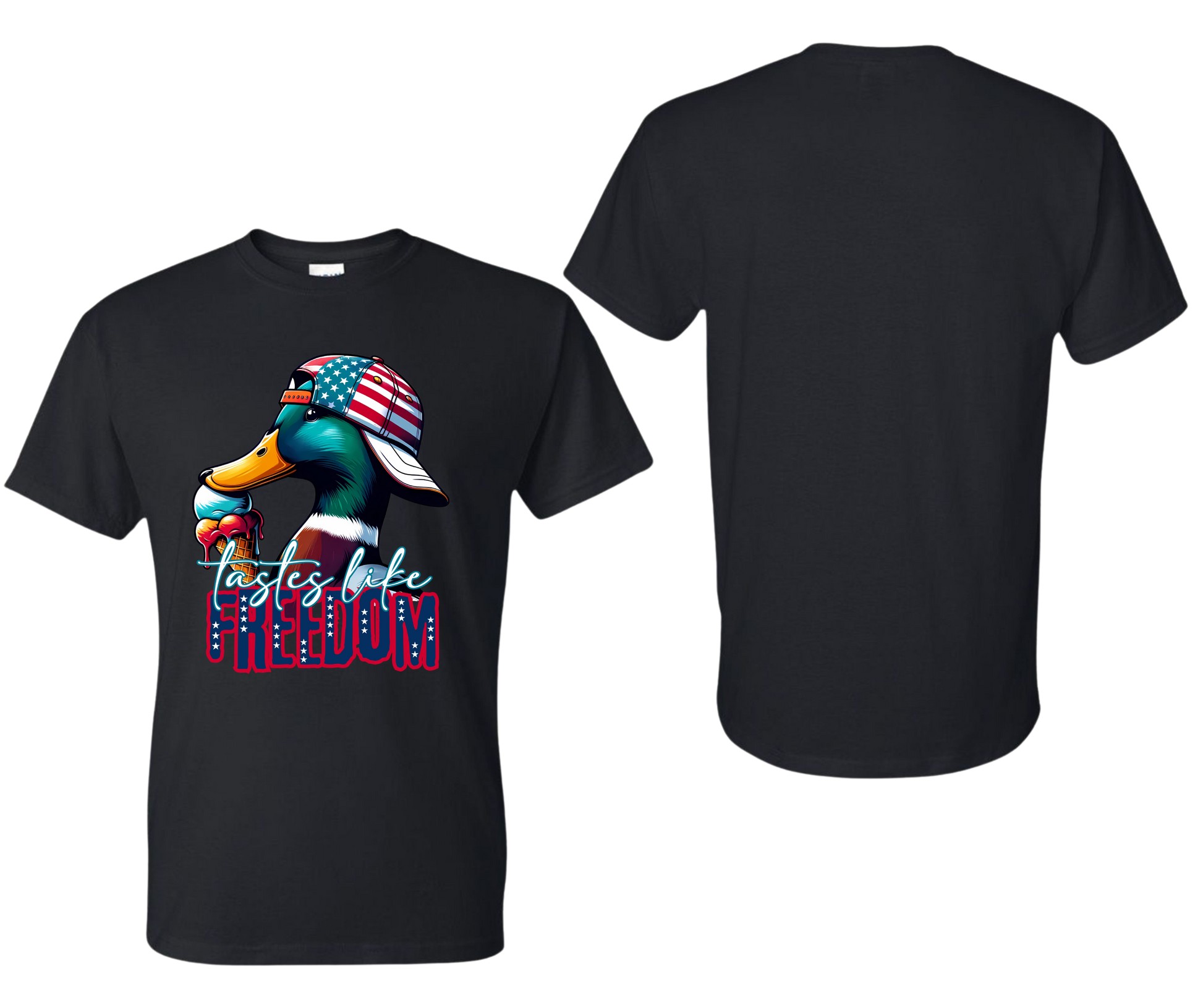 Get ready to quack up your style with our "Tastes Like Freedom" T-Shirt! Featuring a cool duck sporting a patriotic cap and savoring a delicious treat, this shirt is all about celebrating freedom with a fun twist. Perfect for Fourth of July parties, BBQs, or just everyday wear, this t-shirt is sure to turn heads and spread smiles.